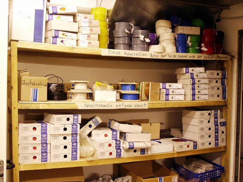 Backstage-Ansichten, und darin verborgen auch noch das lang ersehnte Bild der Ladestation. Aber alles in allem klar zu erkennen: Nur das Genie beherrscht das Chaos... Materiallager Kabel - derzeit streiten wir übrigens darüber, ob wir schon 1000 oder gar 5.000 km Kabel verlegt haben. Wichtig dabei zu wissen: Multicore-Leitungen zählen wir dabei entsprechend der Anzahl ihrer Adern (denn ohne diese Leitungen müssten ja entsprechend viele einzelne Kabel gezogen werden)